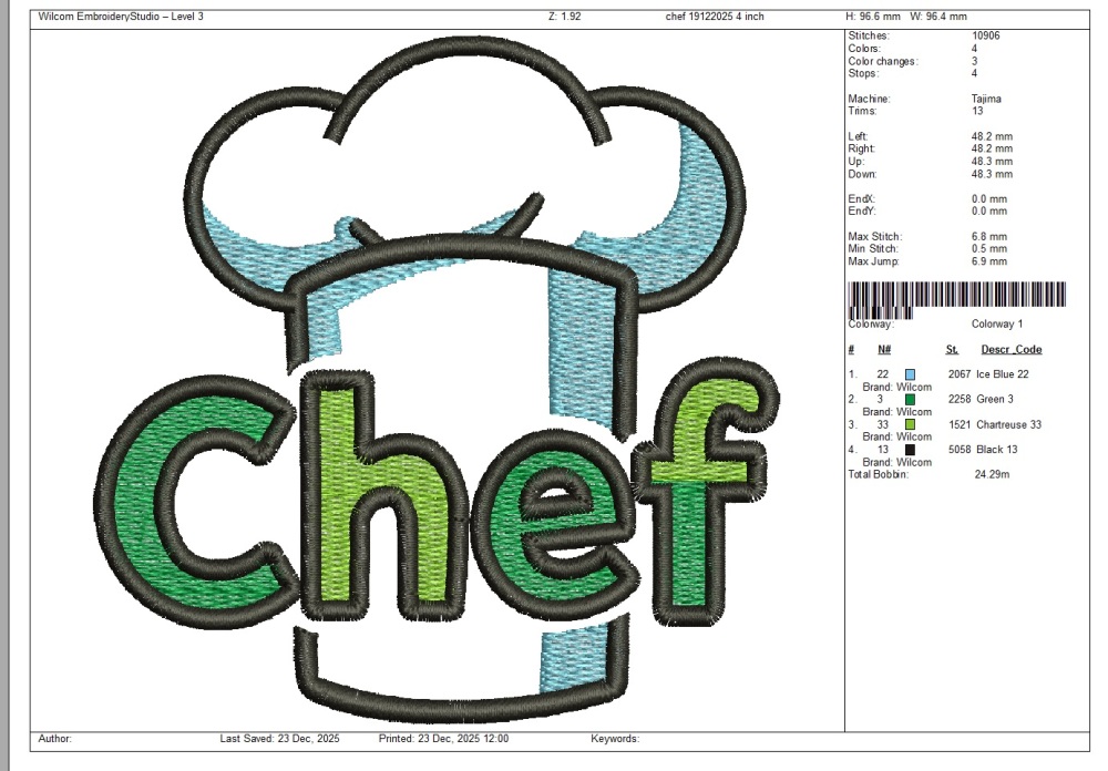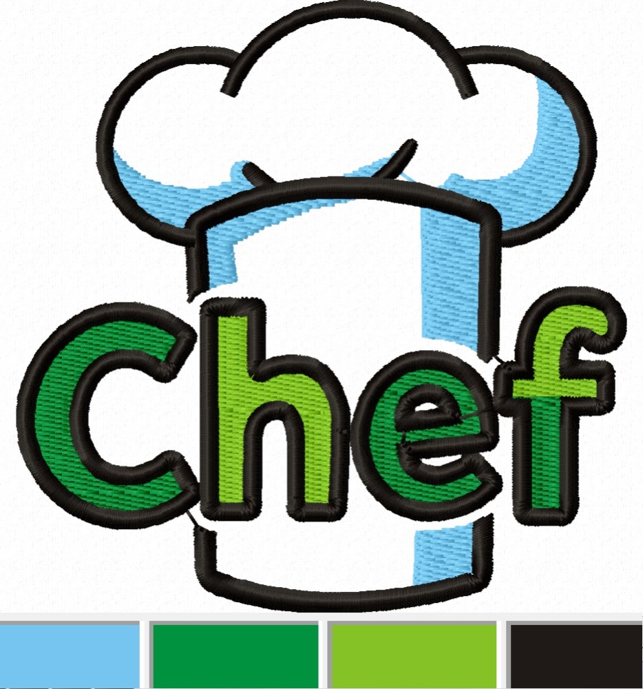 This fun and vibrant design features a traditional chef's toque (hat) paired with bold, colorful "Chef" lettering in a green-to-blue gradient. It has that perfect applique-style look with thick black outlines and textured fill stitches — super cute, professional, and eye-catching! Perfect for all cooking enthusiasts, this design adds a touch of culinary charm to any project. It's a bestseller for kitchen-themed embroidery! Great for Personalizing chef aprons, hats, and uniforms, Kitchen towels, potholders, table runners, and dishcloths, Gifts for chefs, cooks, bakers, or culinary students (birthdays, holidays, or professional milestones), Kids' "little chef" or "chef in training" aprons, Home decor: pillows, wall hangings, tote bags, or BBQ accessories