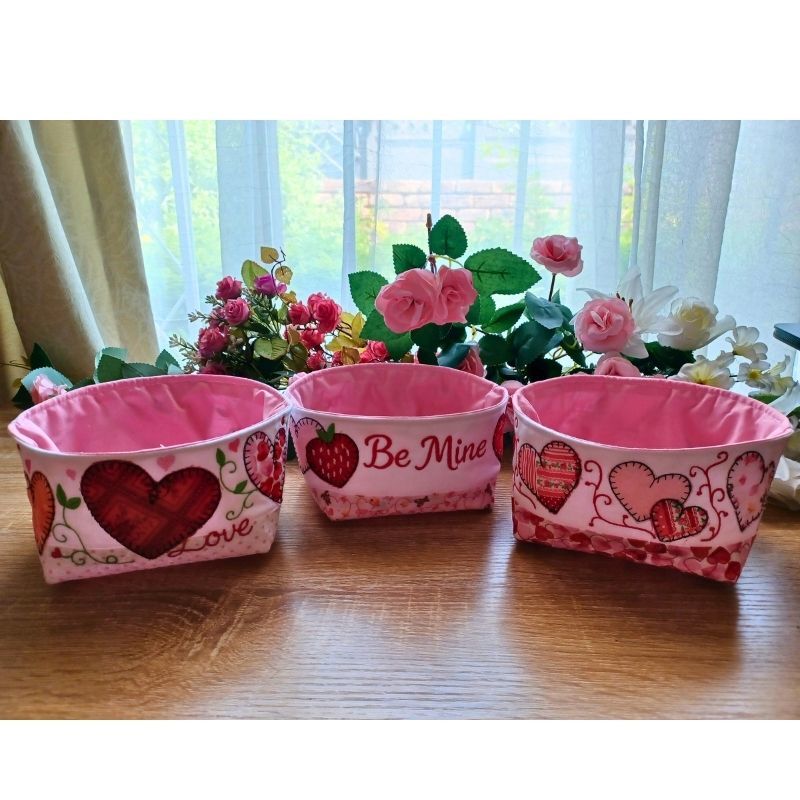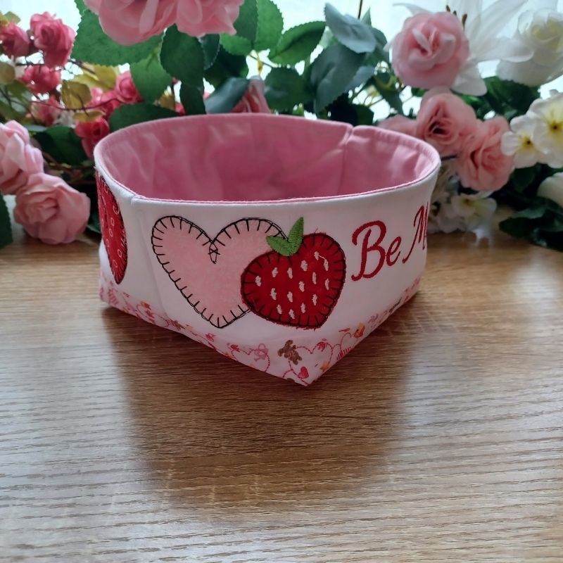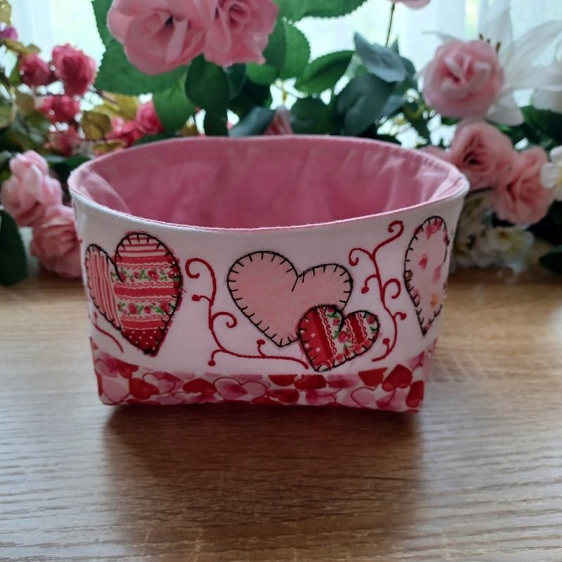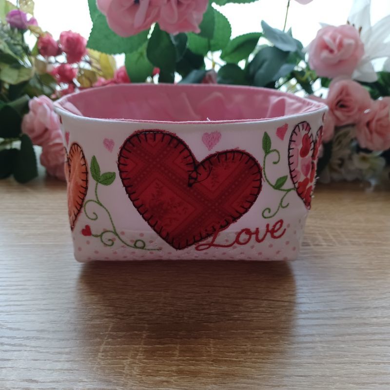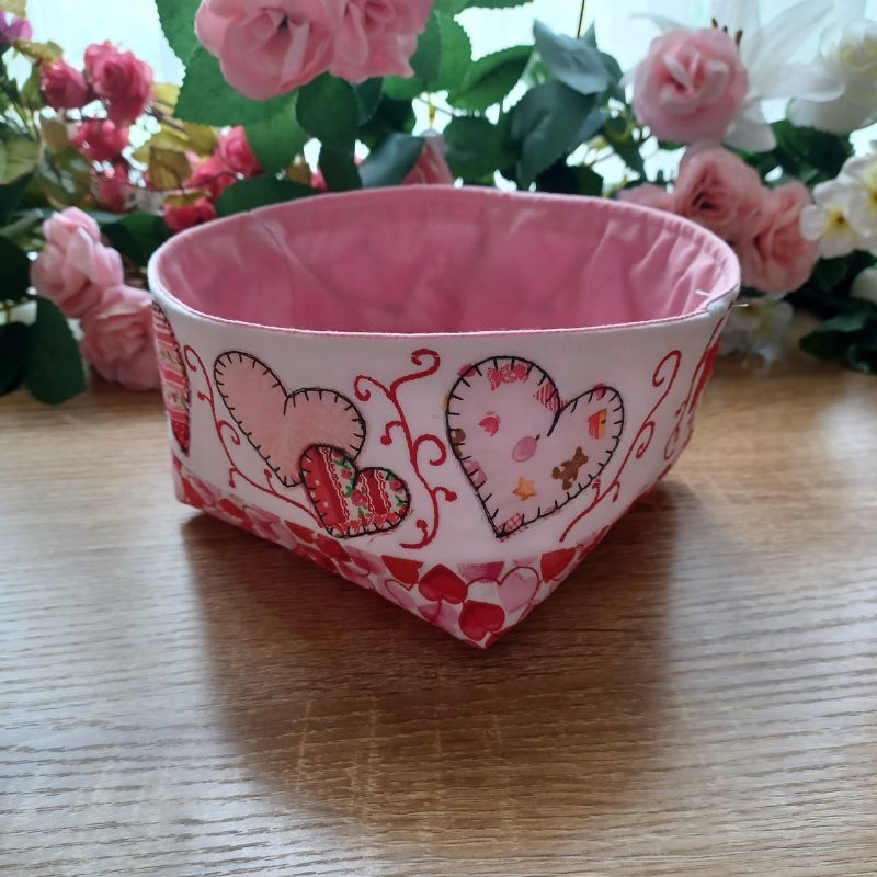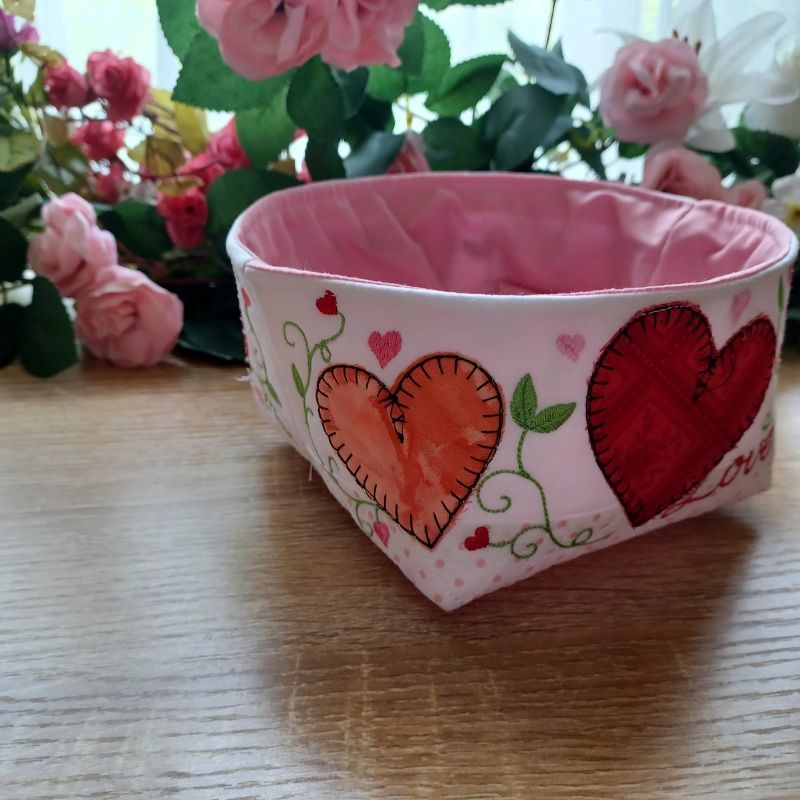 These fun and easy fabric bowls are perfect for your Valentines table or gifts. The appliqued and quilted bowl is made in the hoop. The finishing and lining is done using a sewing machine.