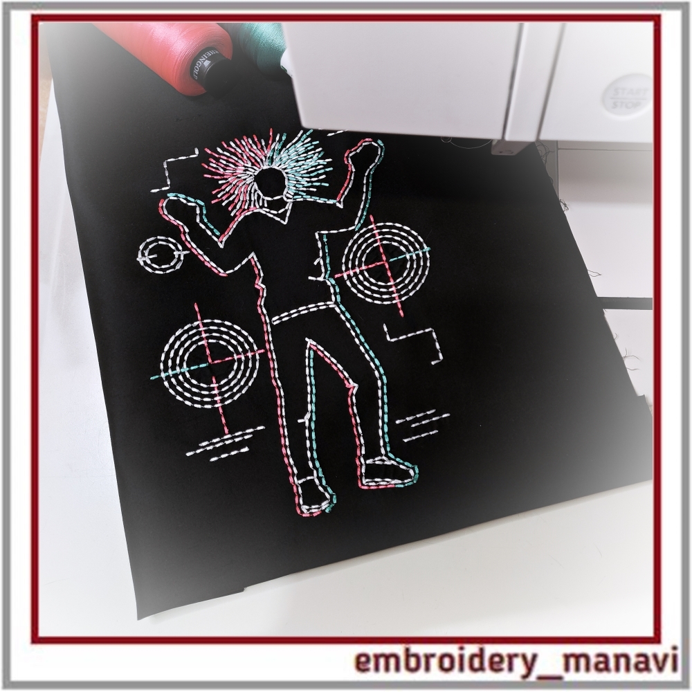 👉A modern line art / outline machine embroidery design set inspired by sashiko and glitch “eureka” aesthetics with a glowing effect. The pack includes three designs: a framed boy suitable for appliqué, an open figure and a decorative circle. Recommended fabrics include dense cotton, denim, canvas, twill, best results appear on dark stable fabrics with proper stabilization using a tear away stabilizer of at least 60 gsm. Not recommended for thin loose knits.