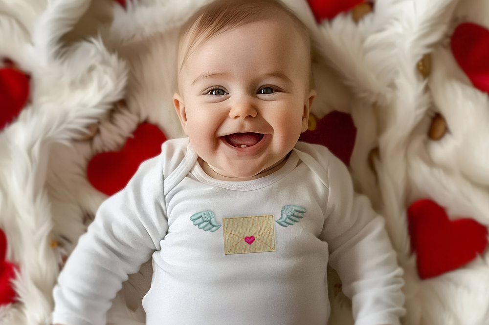 Get in the mood for love with this flying envelope mini embroidery with a heart and wings.